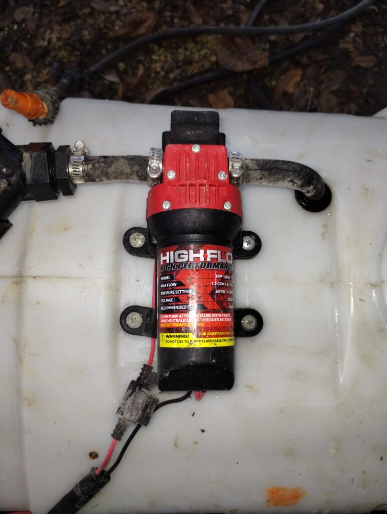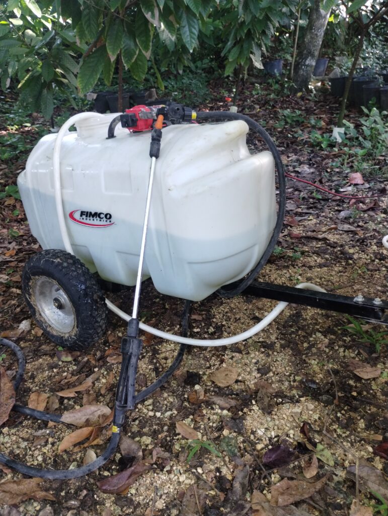 Tanque Fimco de veinticinco (25) galones para rociar líquidos. Tiene bomba eléctrica Highflo 12V que conecta a batería, manga extendida y pistero. Lo puedes arrastrar. $300