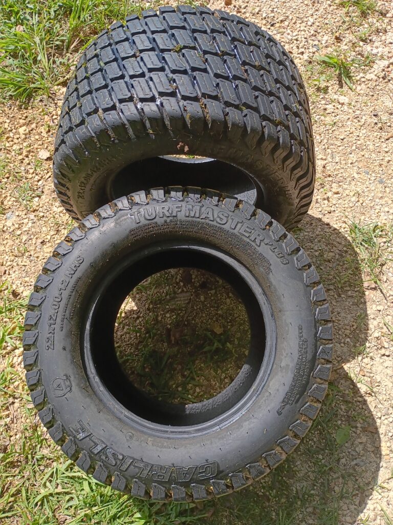 Dos (2) gomas Carlisle Turfmaster tamaño 22x12x12 para cortadora de pasto. Una goma tiene inyección. $50.00 las dos (2) gomas.